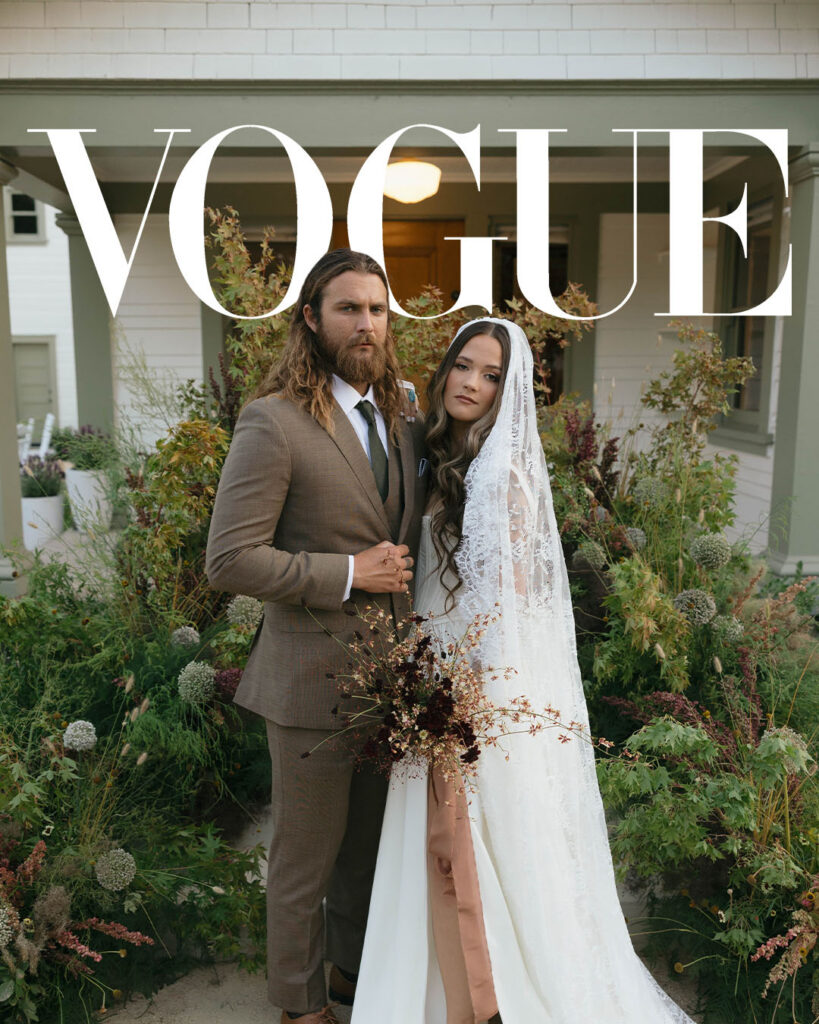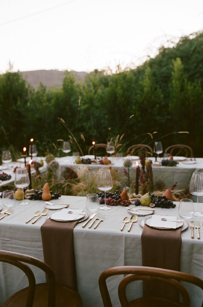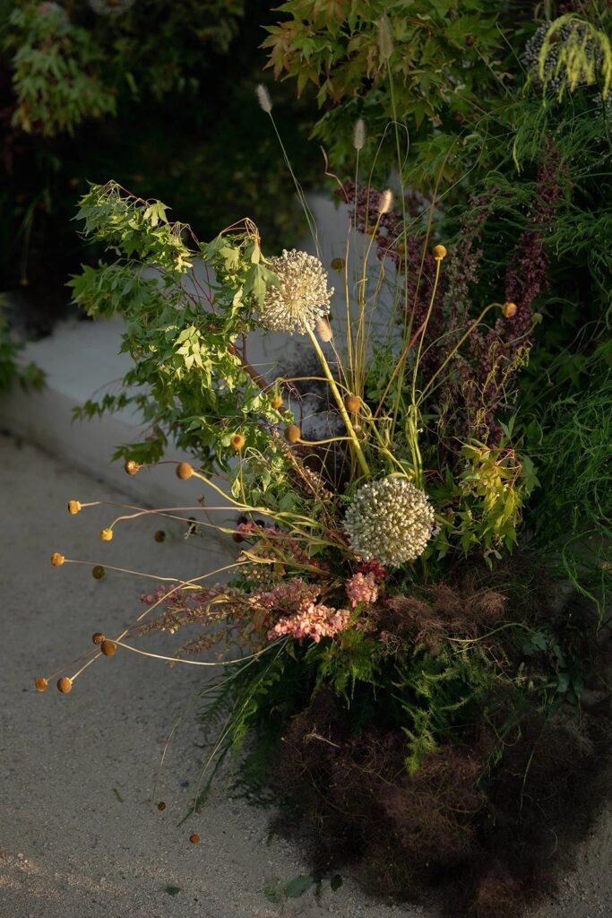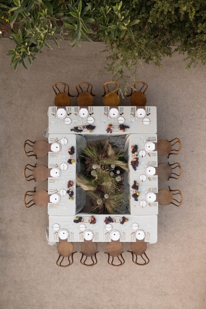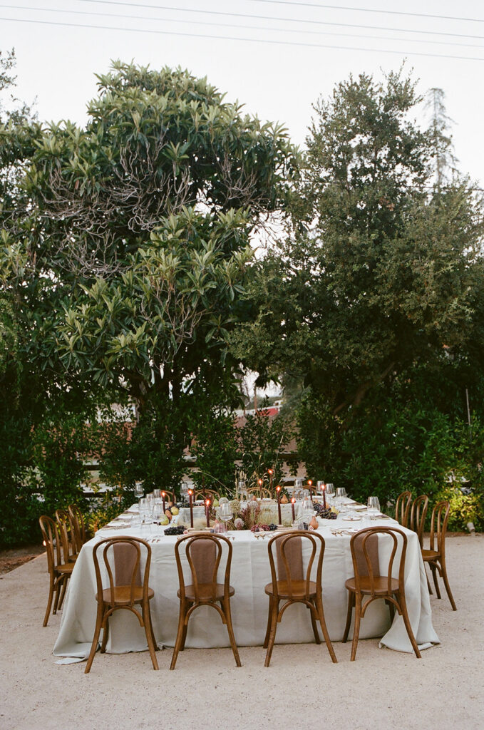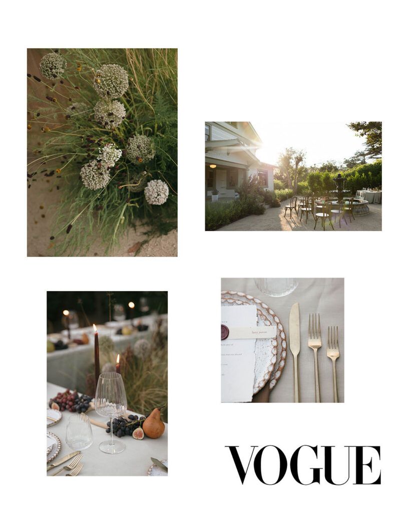 San Juan Capistrano is known for it’s raw, rugged, and historic Ranch culture. This editorial, styled by Wilde and Sage Co, emphasized the natural terrain while bringing in a moody yet elegant autumnal touch. We designed a cozy intimate table arrangement where guests all faced each other, completed with wispy grasses and textural blooms in a unique and grounded floral tablescape. Maple branches arched around the couple for their staircase set ceremony, with the bride carrying a moody bouquet of orchids and chocolate cosmos. I loved working with talented local vendors to bring this shoot to life. We are so honored to have seen this shoot featured in the October 2024 print of British Vogue.