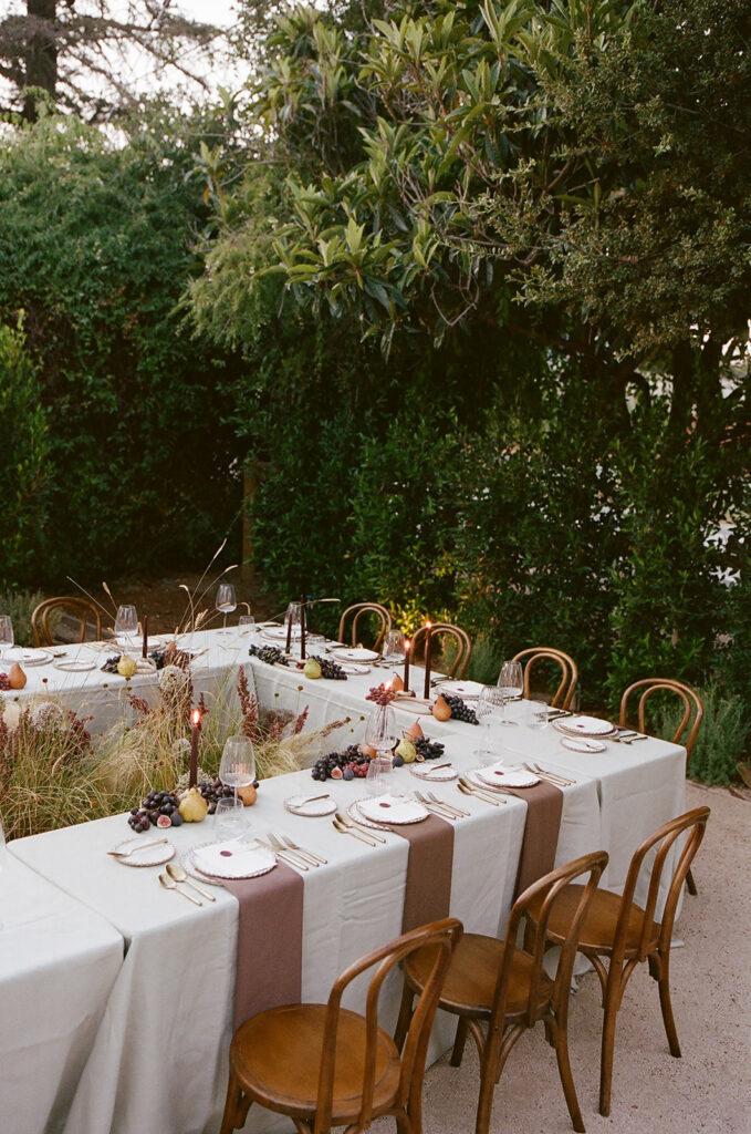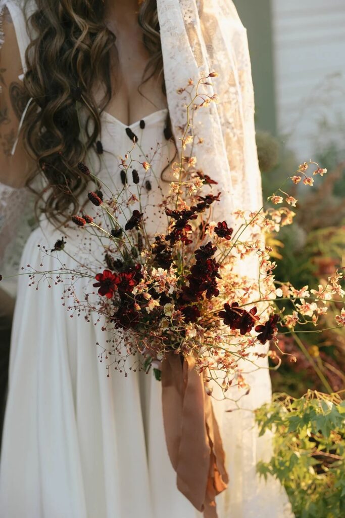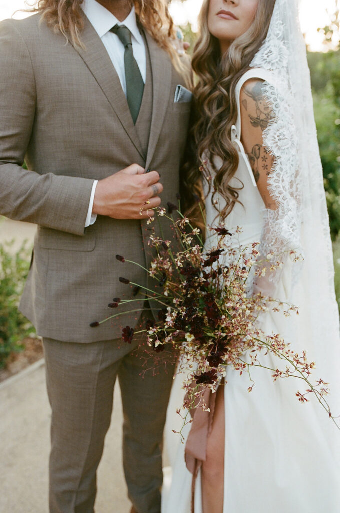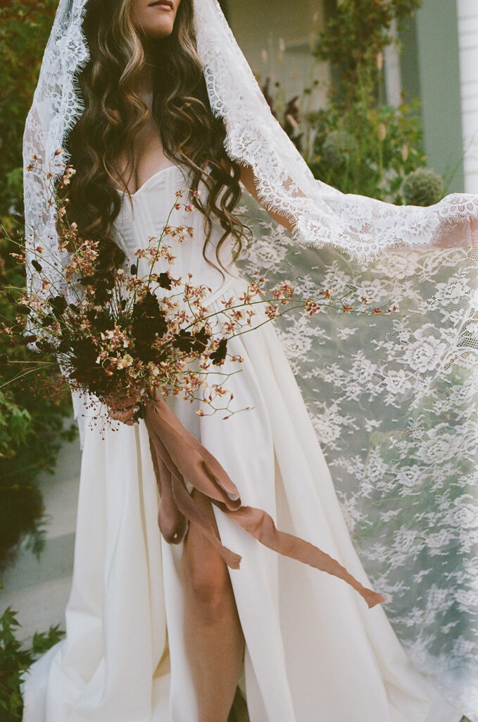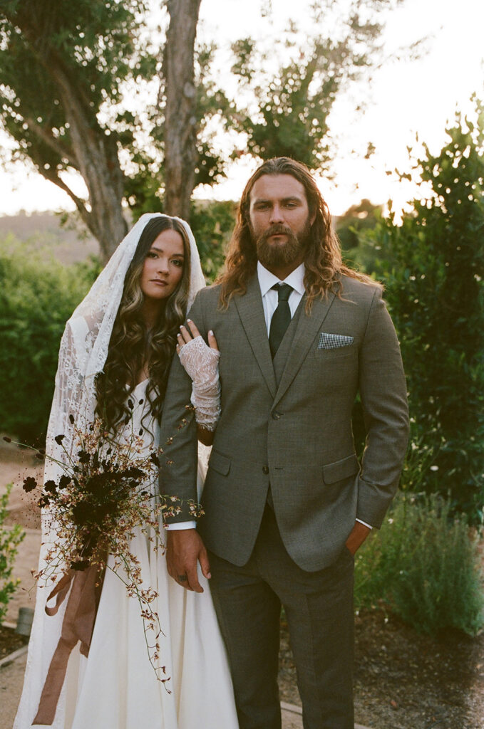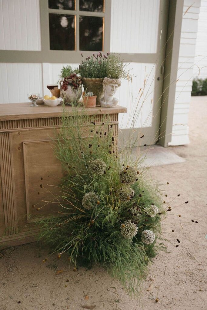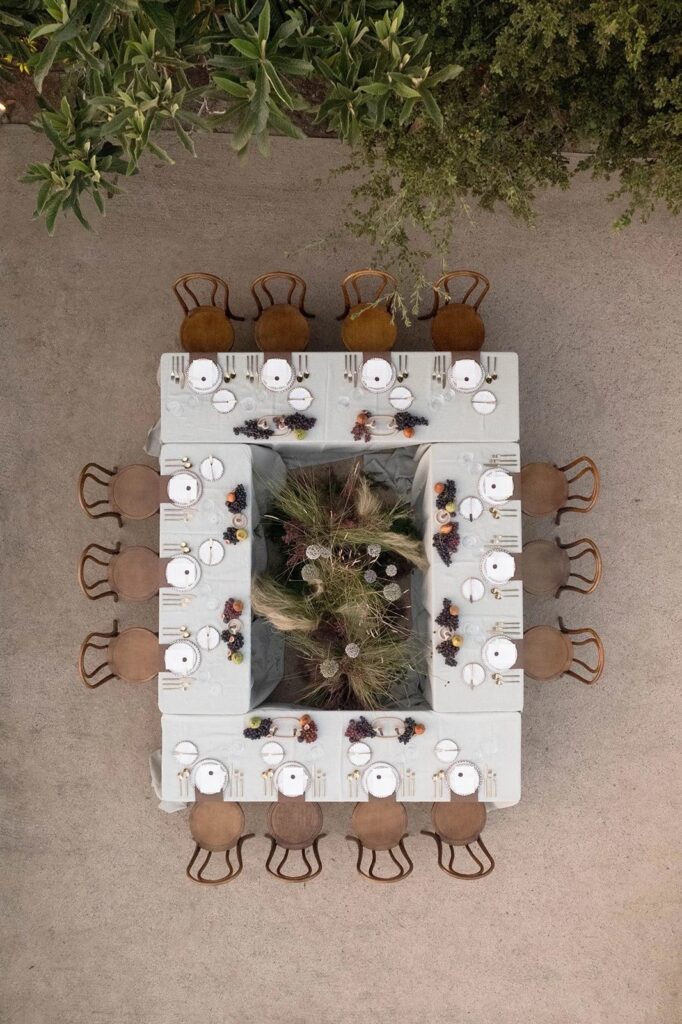 San Juan Capistrano is known for it’s raw, rugged, and historic Ranch culture. This editorial, styled by Wilde and Sage Co, emphasized the natural terrain while bringing in a moody yet elegant autumnal touch. We designed a cozy intimate table arrangement where guests all faced each other, completed with wispy grasses and textural blooms in a unique and grounded floral tablescape. Maple branches arched around the couple for their staircase set ceremony, with the bride carrying a moody bouquet of orchids and chocolate cosmos. I loved working with talented local vendors to bring this shoot to life. We are so honored to have seen this shoot featured in the October 2024 print of British Vogue.