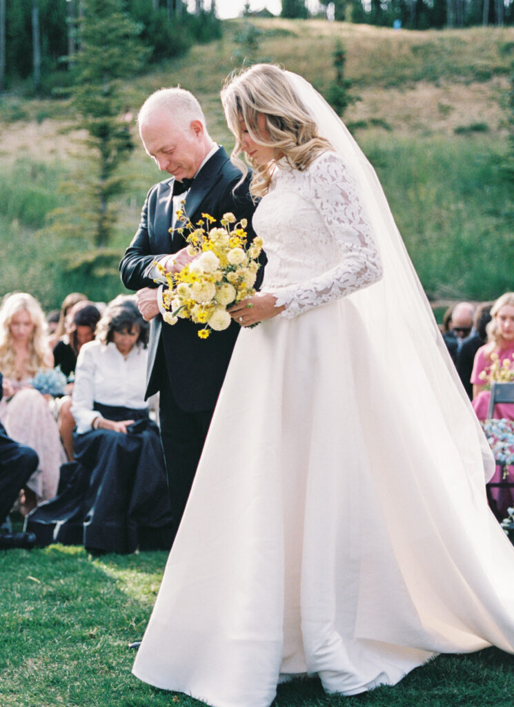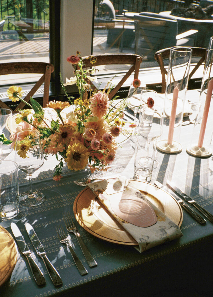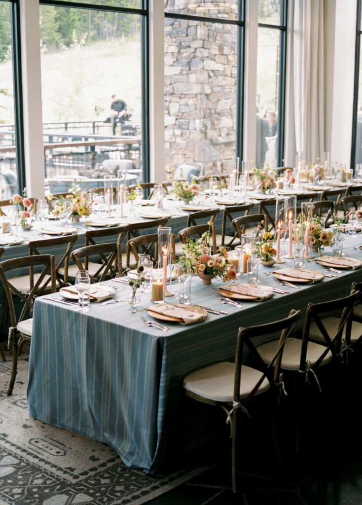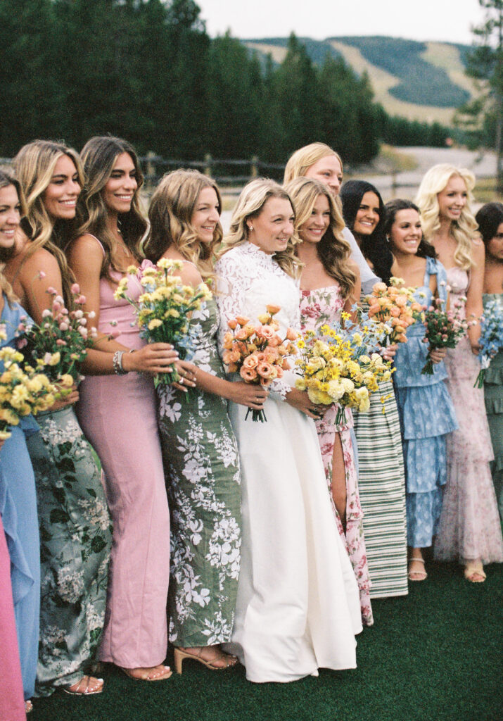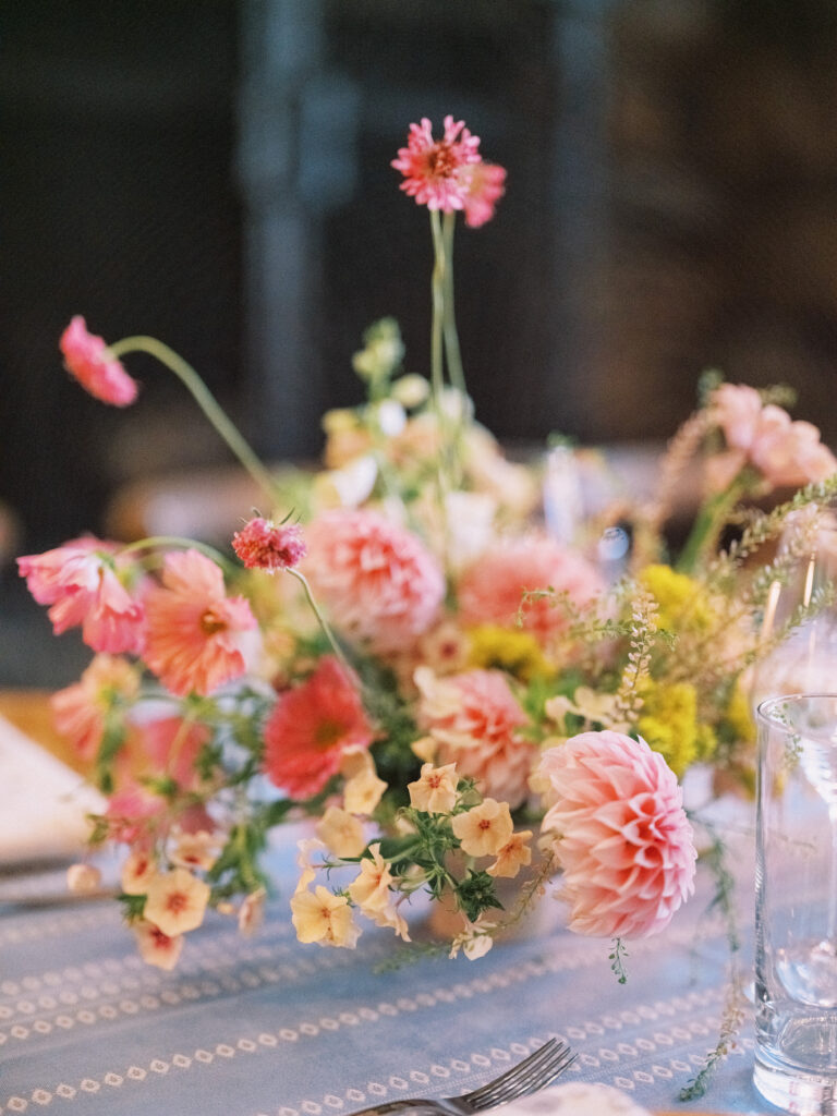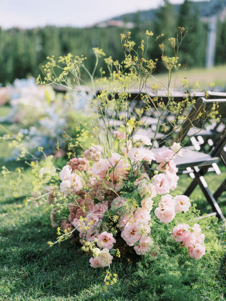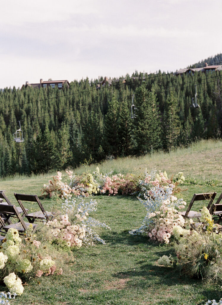 Madison + Riley said “I do” on the slopes of the Madison mountain range in Big Sky, Montana, a place she grew up skiing at every winter. In August, the mountains in Montana turn a vibrant green and the air is filled with a happy warmth. Wildflower patches are in full bloom with a stunning array of colors and textures. We brought Madison’s bubbly personality to light through a preppy palette of pinks, dandelion yellow, and denim blue, but with the textures of an alpine meadow to fuse her Texan + mountain heritage. Her cheerful wildflower bouquet looked as if it were plucked from the mountainside, and contrasted brightly against the lush green slopes. Inside the lodge, wispy + wild centerpieces lined the guest tables using Mountain grown floral such as straw flower, phlox, zinnia, cosmos and foxgloves in shades of blush, peach, and buttercream. Guests dined amongst a cozy candlelight and a roaring fireplace as the air cooled outside. I loved working alongside Britt from Britt Floral Co to bring this preppy Western wedding to life.