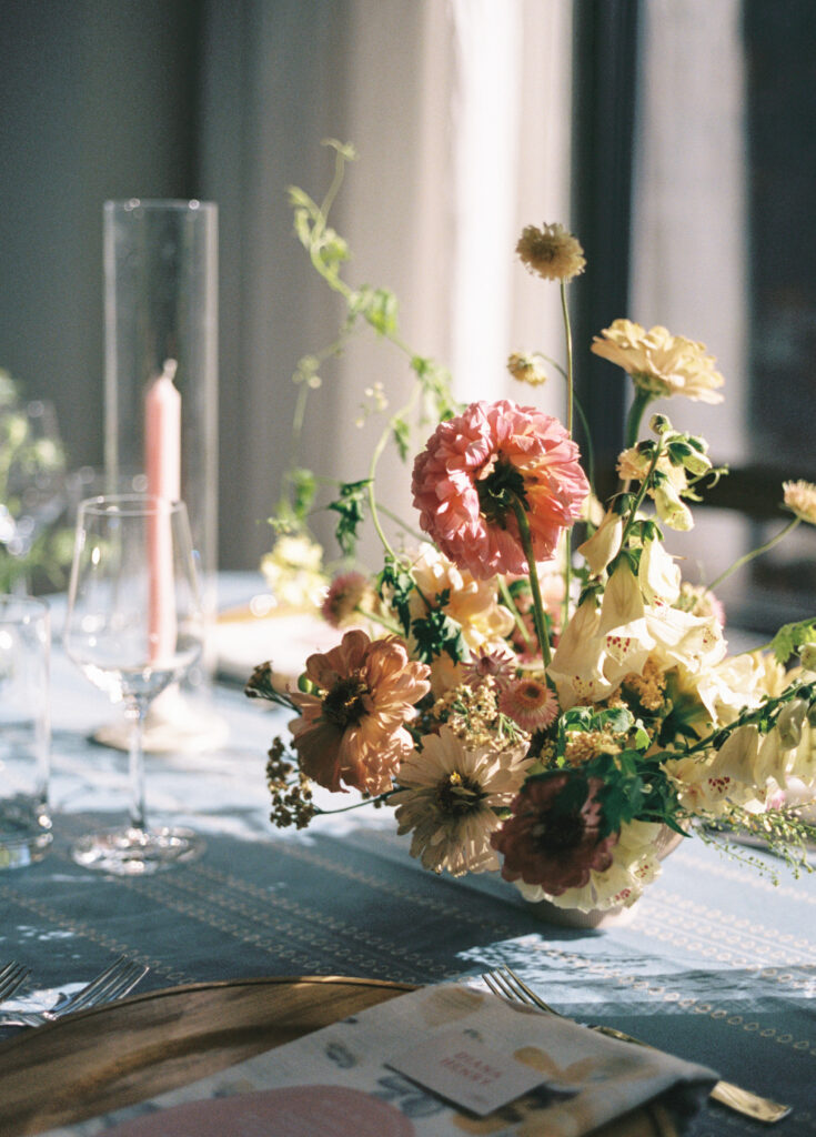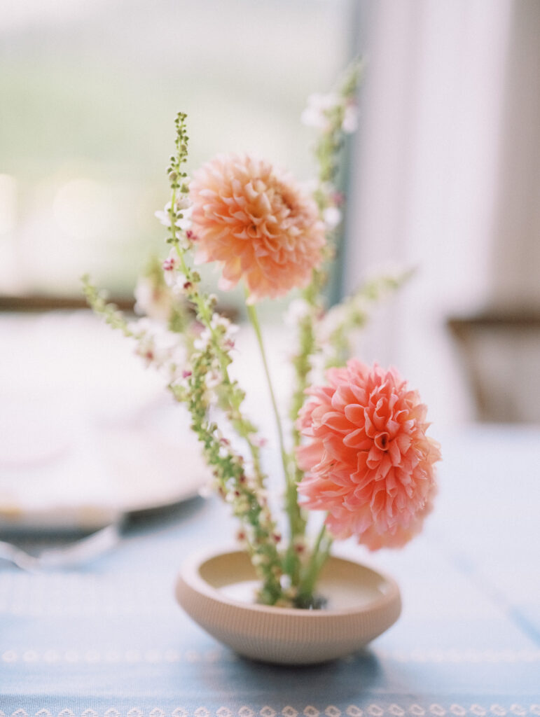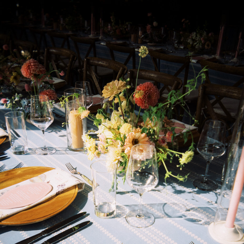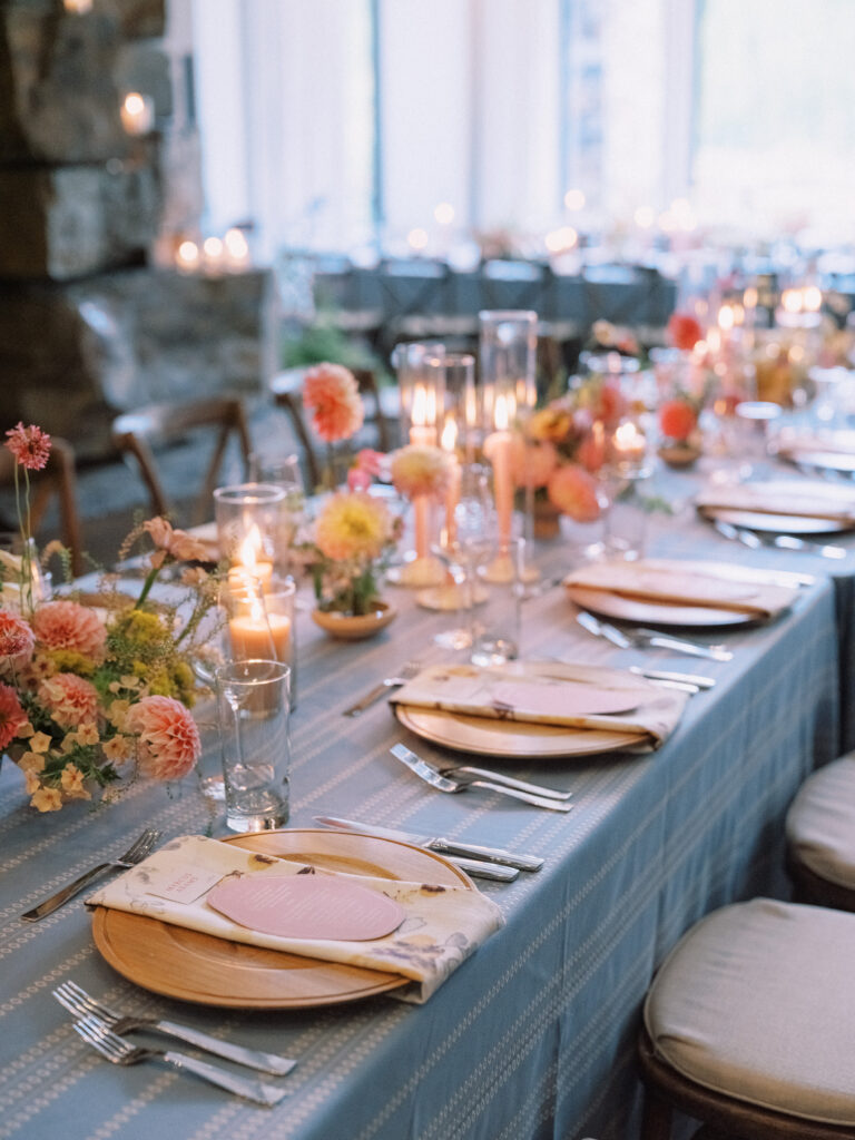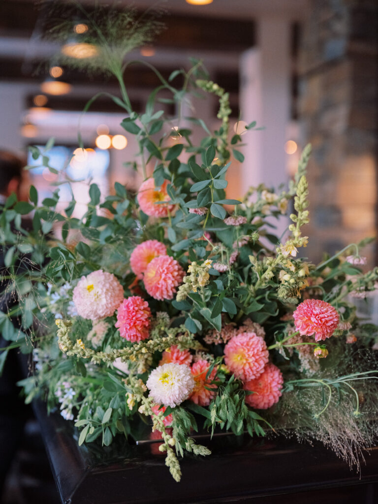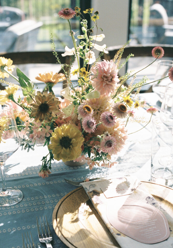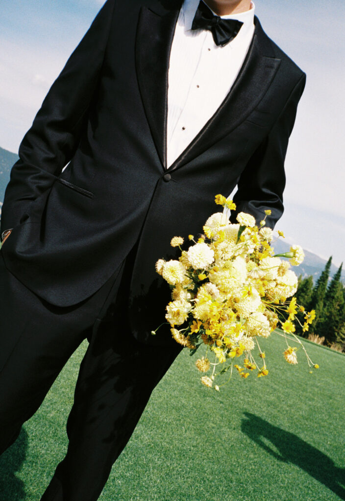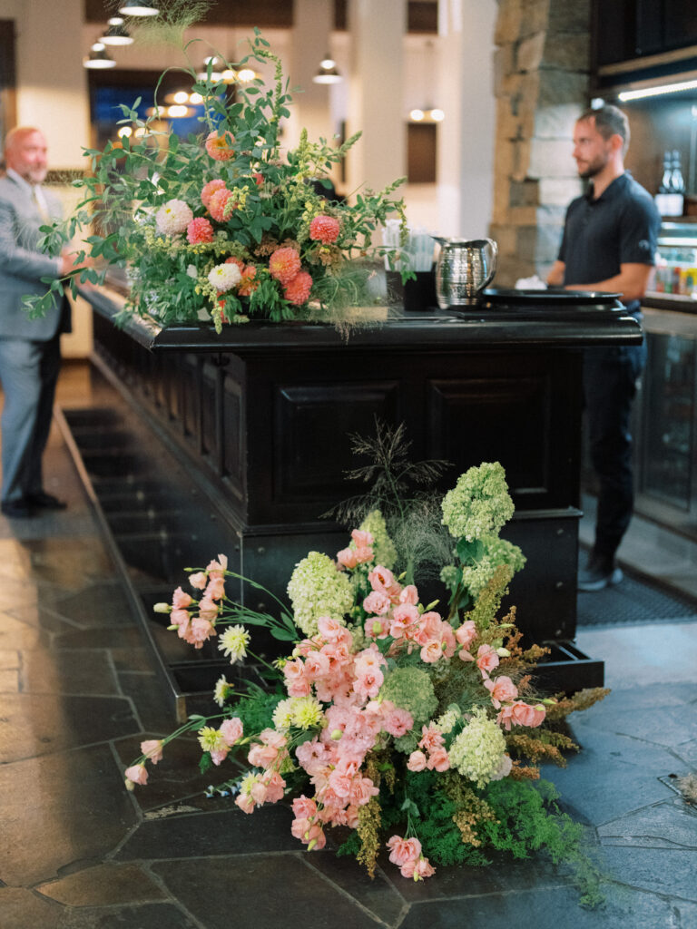 Madison + Riley said “I do” on the slopes of the Madison mountain range in Big Sky, Montana, a place she grew up skiing at every winter. In August, the mountains in Montana turn a vibrant green and the air is filled with a happy warmth. Wildflower patches are in full bloom with a stunning array of colors and textures. We brought Madison’s bubbly personality to light through a preppy palette of pinks, dandelion yellow, and denim blue, but with the textures of an alpine meadow to fuse her Texan + mountain heritage. Her cheerful wildflower bouquet looked as if it were plucked from the mountainside, and contrasted brightly against the lush green slopes. Inside the lodge, wispy + wild centerpieces lined the guest tables using Mountain grown floral such as straw flower, phlox, zinnia, cosmos and foxgloves in shades of blush, peach, and buttercream. Guests dined amongst a cozy candlelight and a roaring fireplace as the air cooled outside. I loved working alongside Britt from Britt Floral Co to bring this preppy Western wedding to life.