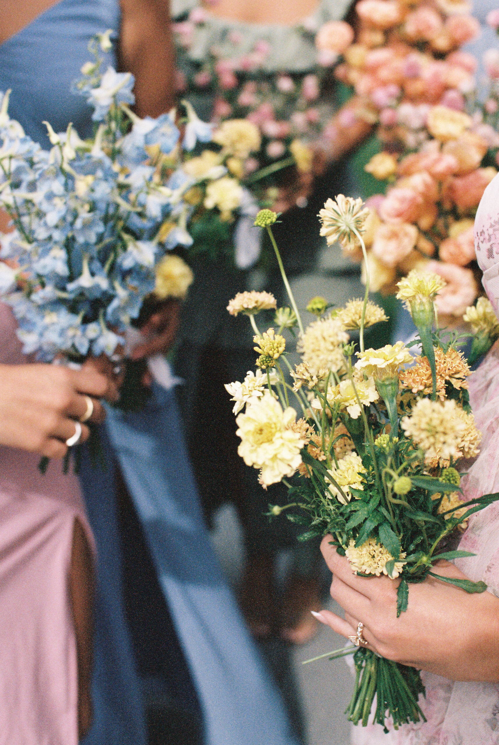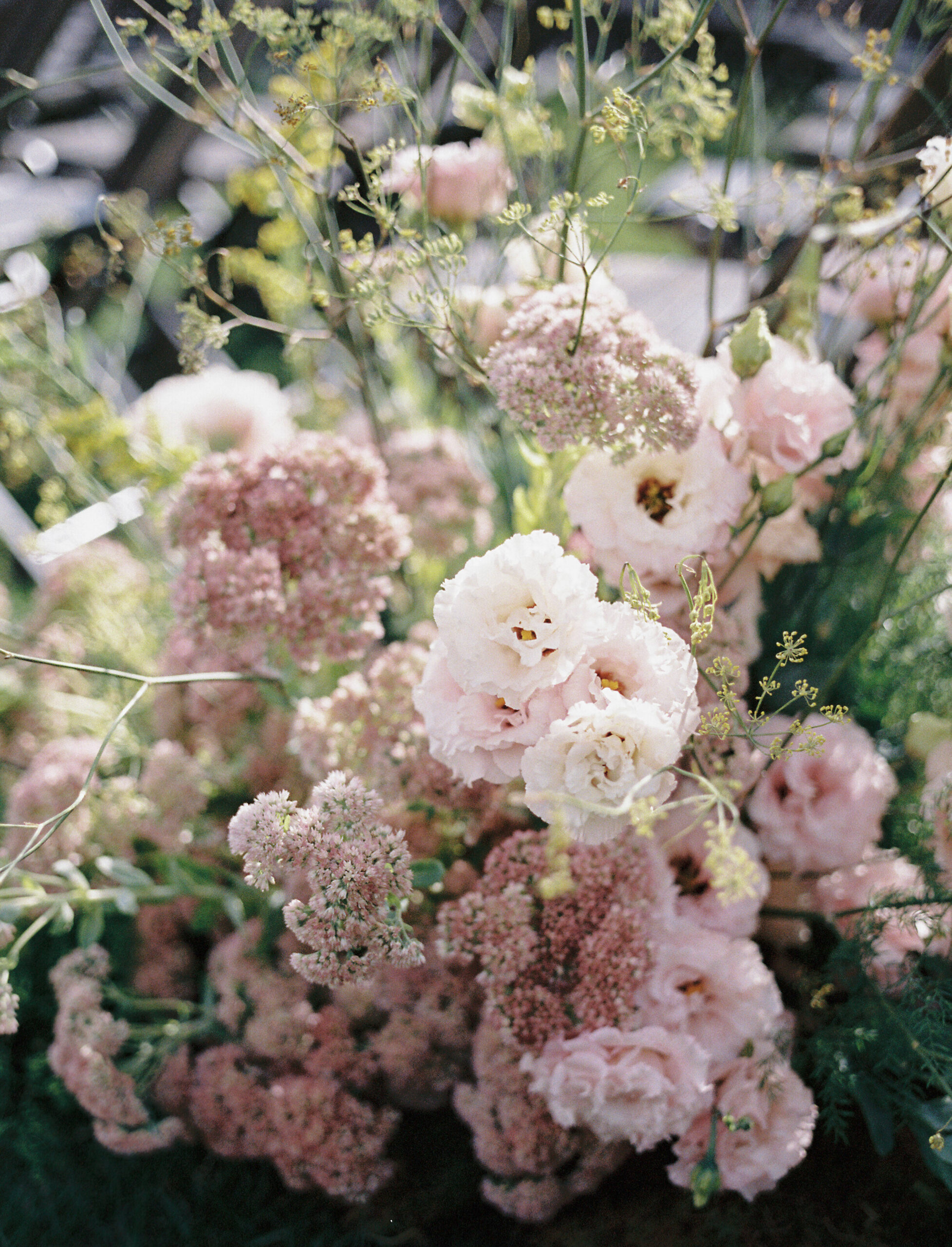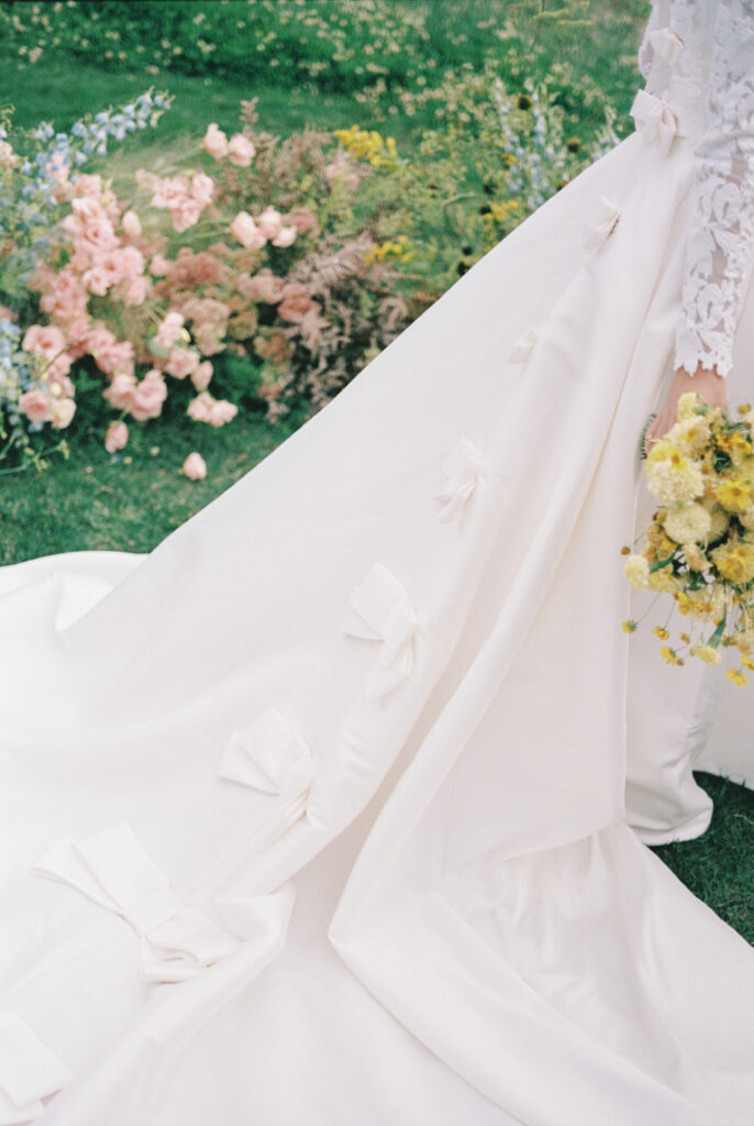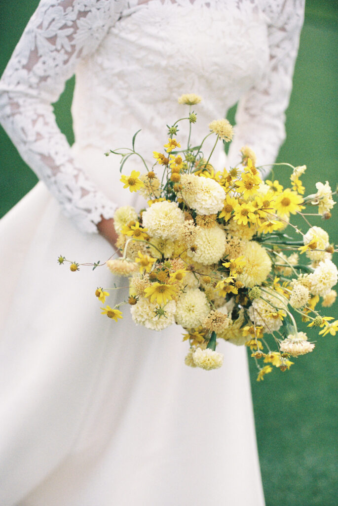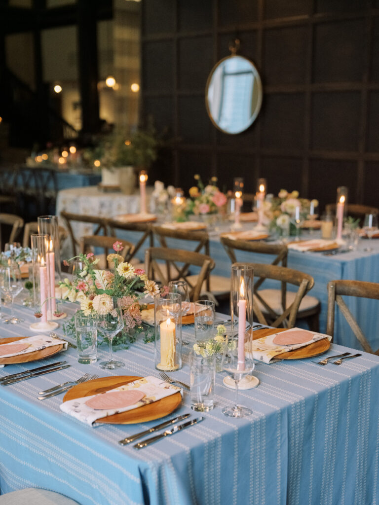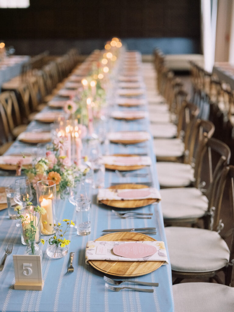 Madison + Riley said “I do” on the slopes of the Madison mountain range in Big Sky, Montana, a place she grew up skiing at every winter. In August, the mountains in Montana turn a vibrant green and the air is filled with a happy warmth. Wildflower patches are in full bloom with a stunning array of colors and textures. We brought Madison’s bubbly personality to light through a preppy palette of pinks, dandelion yellow, and denim blue, but with the textures of an alpine meadow to fuse her Texan + mountain heritage. Her cheerful wildflower bouquet looked as if it were plucked from the mountainside, and contrasted brightly against the lush green slopes. Inside the lodge, wispy + wild centerpieces lined the guest tables using Mountain grown floral such as straw flower, phlox, zinnia, cosmos and foxgloves in shades of blush, peach, and buttercream. Guests dined amongst a cozy candlelight and a roaring fireplace as the air cooled outside. I loved working alongside Britt from Britt Floral Co to bring this preppy Western wedding to life.